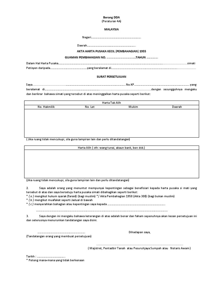Borang Persetujuan Pembahagian Harta Pusaka Bagi Waris Dewasa Yg Tidak Hadir Perbicaraan Doc