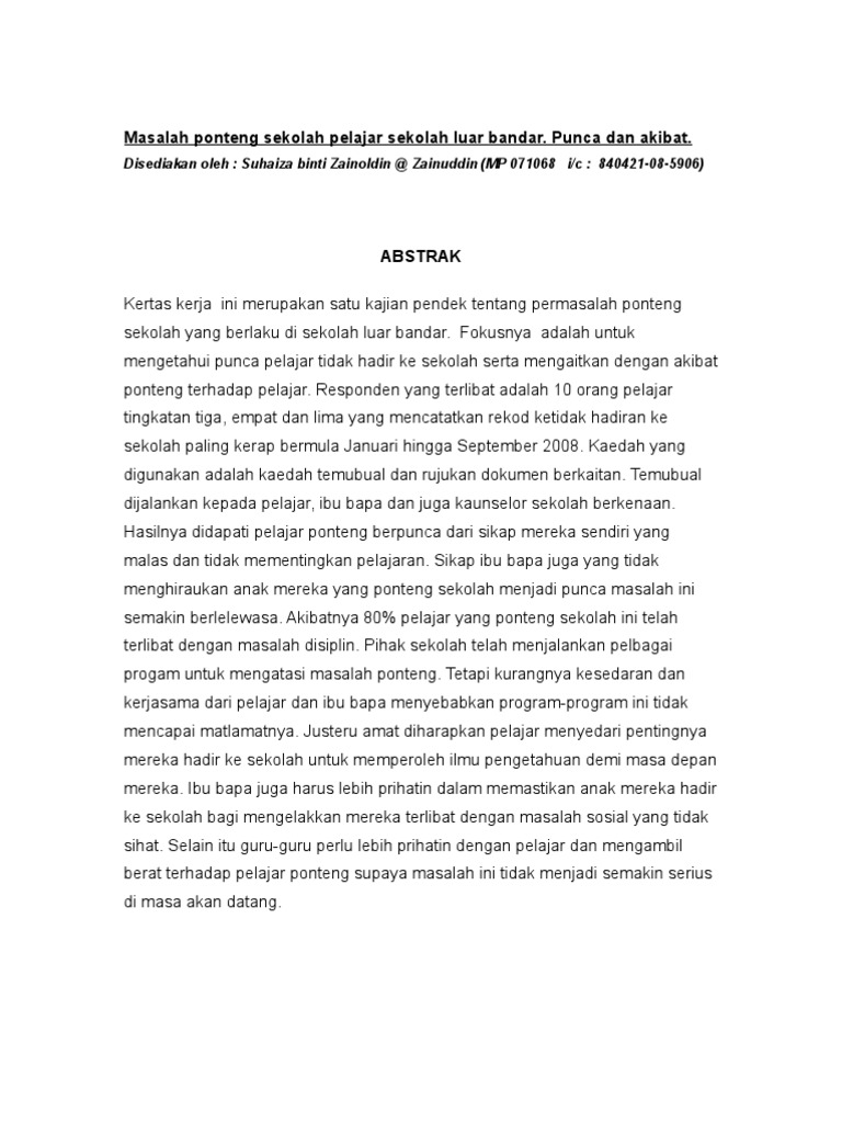 86553304 Kajian Kes Gejala Ponteng Sekolah Dalam Kalangan Murid Suatu Masalah Disiplin