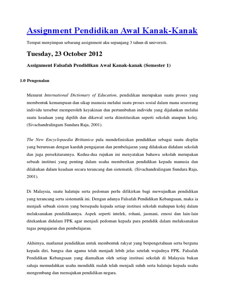 Contoh Assignment Falsafah Pendidikan Awal Kanak Kanak
