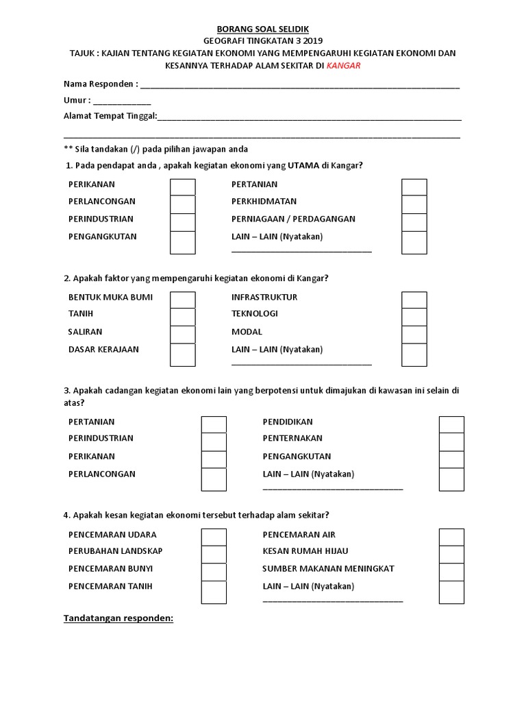 Contoh Borang Soal Selidik Geografi Tingkatan 3 Kegiatan Ekonomi