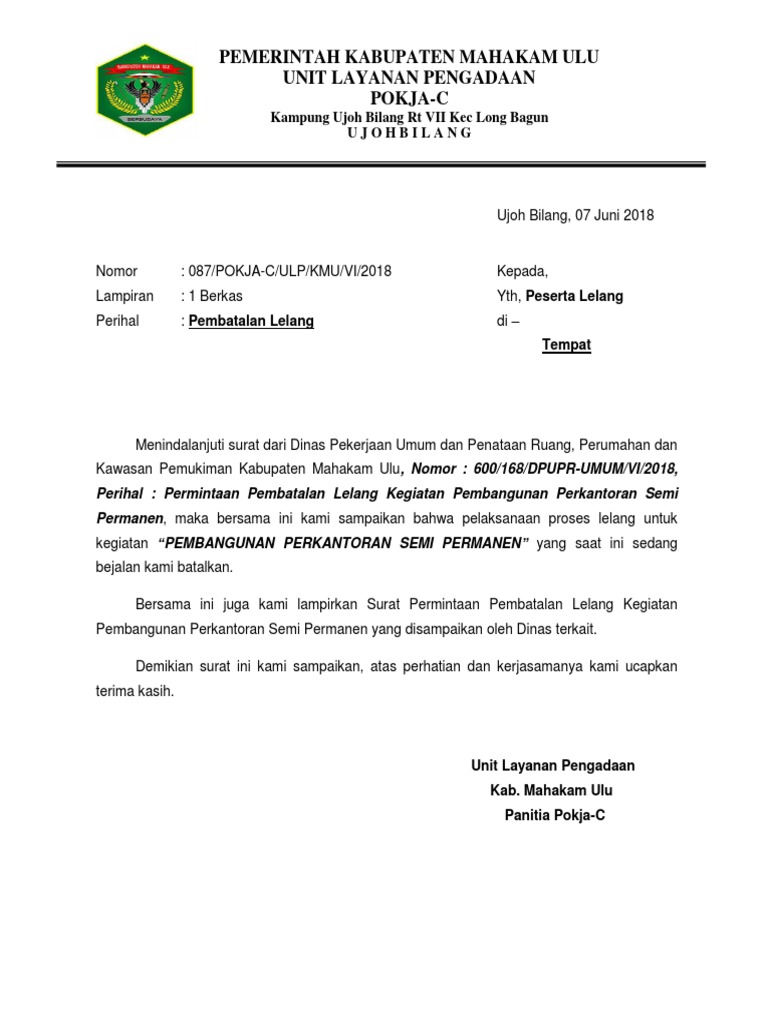 Contoh Surat Permohonan Pembatalan Lelang