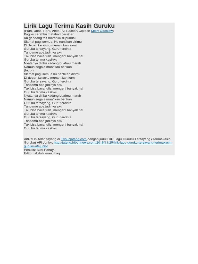 Video Chord Dan Lirik Lagu Terima Kasihku Guruku Untuk Peringati Hari Guru Nasional 25 November Tribunnews Com Mobile