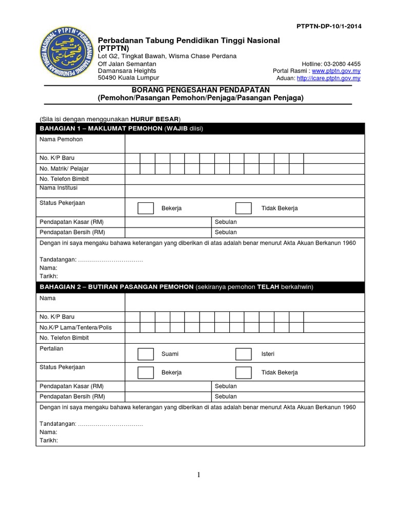 Borang Pengesahan Pendapatan Ptptn