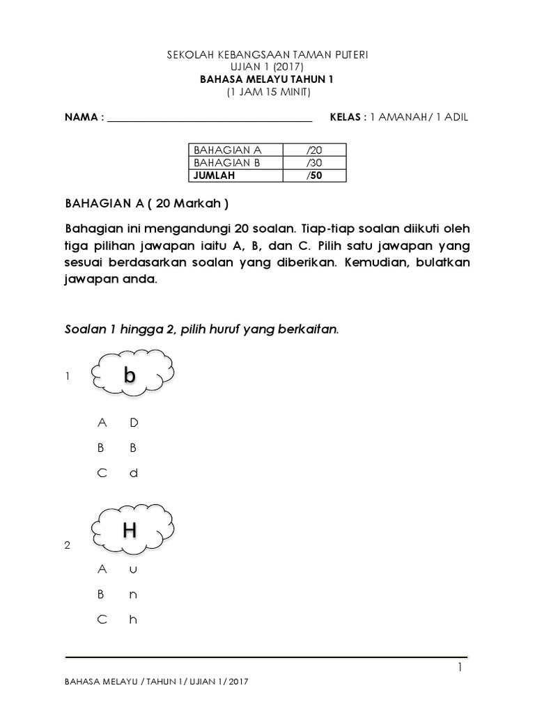 Soalan Ujian Bahasa Melayu Tahun 1 2017